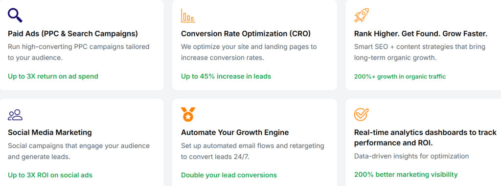 📌 SEO Services: They handle everything from boosting your local visibility to optimizing your e-commerce site, aiming to increase your search engine rankings and attract more traffic.