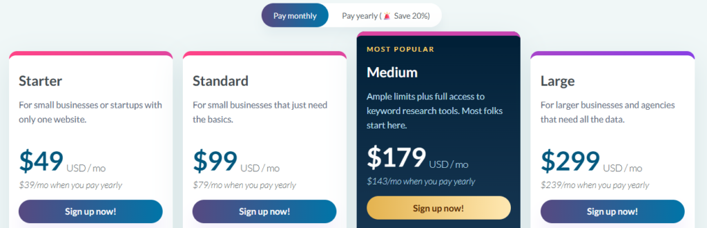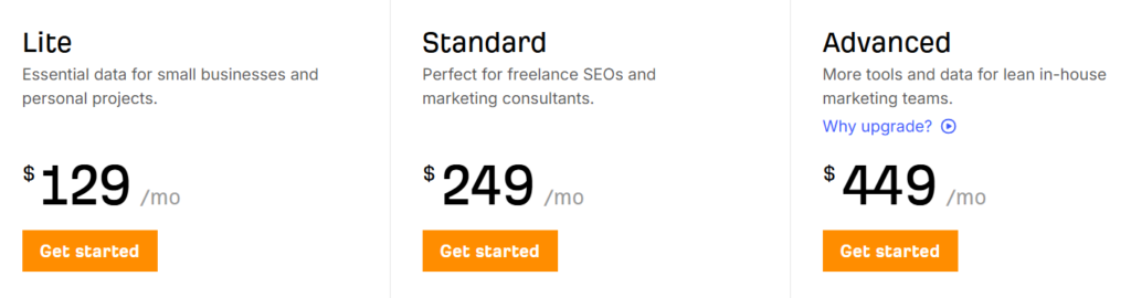 | Description | Essential data for small businesses and hobby projects. | Perfect for freelance SEOs and marketing consultants. | More tools and data for lean in-house marketing teams. | Ideal for agencies and enterprises. |