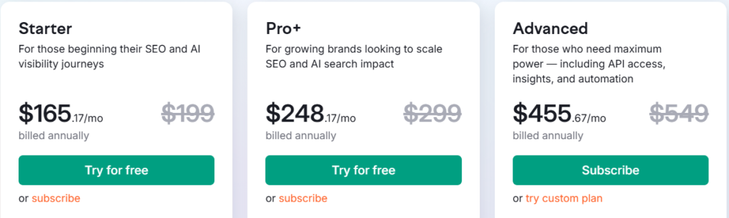 | Features | SEO, PPC, research tools: Competitor analysis, keyword research, website audit, backlink analysis, advertising tools, and more | All Pro features plus: Content Marketing Toolkit, historical data, multi-location and device tracking, Looker Studio integration, and more | All Guru features plus: Share of Voice, extended limits, API access, PLA analytics, free migration from third-party tools, and more |