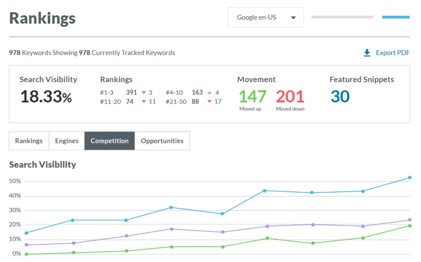 It provides data on the keywords driving traffic to your and your competitors’ websites. This can help you identify high-performing keywords you may not be targeting yet but should consider incorporating into your content and SEO strategies.